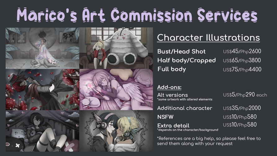 I mainly do SFW commissions through VGen. If you do not have a VGen Client account, you can still avail commissions on the site using your e-mail as a Guest user. Direct commissions are also welcome. Please fill out this form so I can contact you.For NSFW comms, please send an inquiry first in my Retrospring, Strawpage or through private inquiry to discuss the specifics. Please see the FAQs section regarding this policy.Clients from The Philippines are also recommended to send contact requests through this form.
